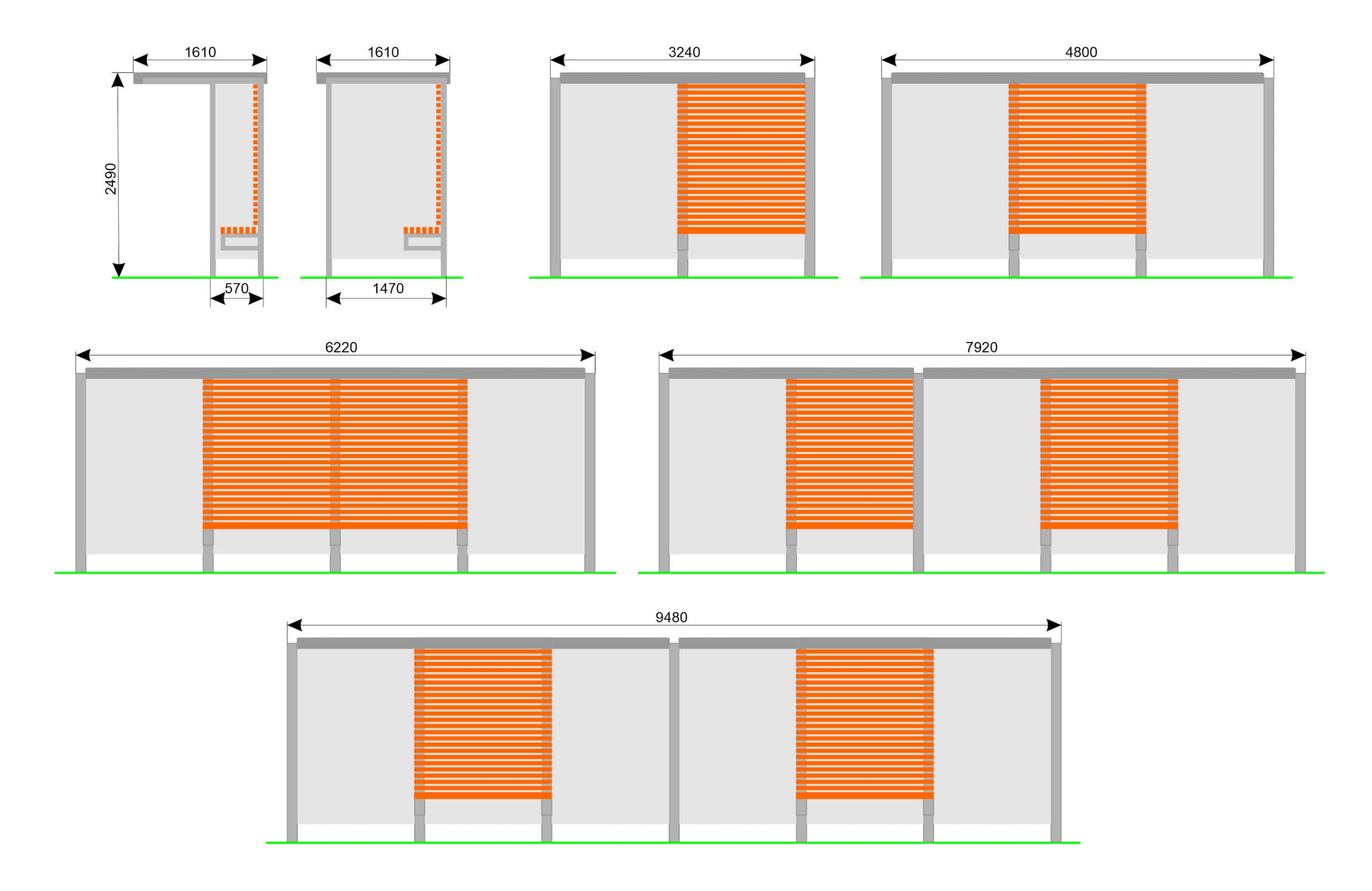 Egyes utasváró modelljeink – a méretüket tekintve – több kivitelben is elérhetőek. A méretválaszték elsősorban az utasváró hosszát jelenti, amit mi a hátfalak számával jellemzünk. Így tehát az utasvárók – modelltől függően – két, három, stb. hátfallal is rendelhetők.