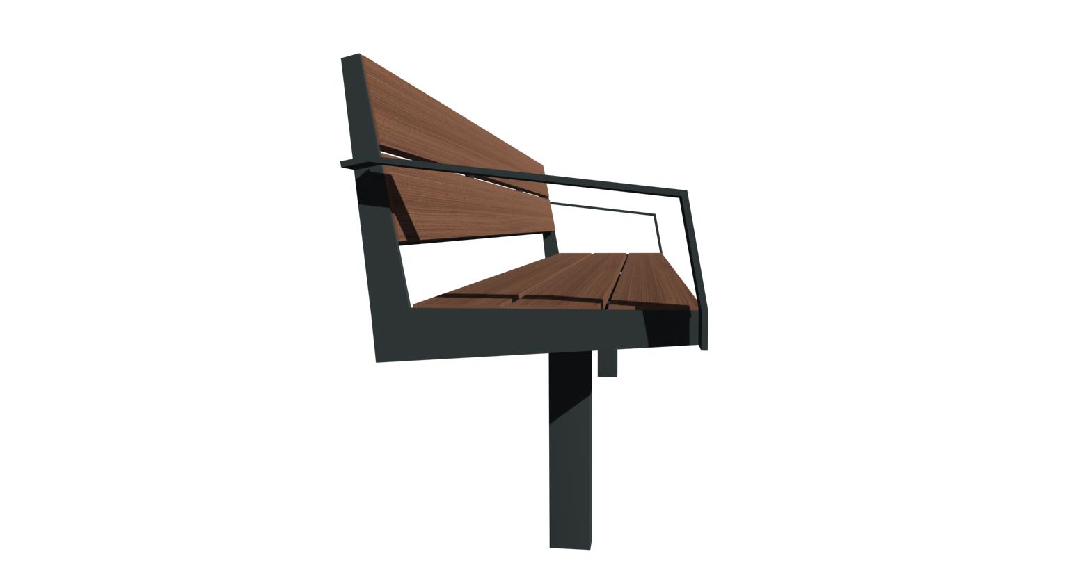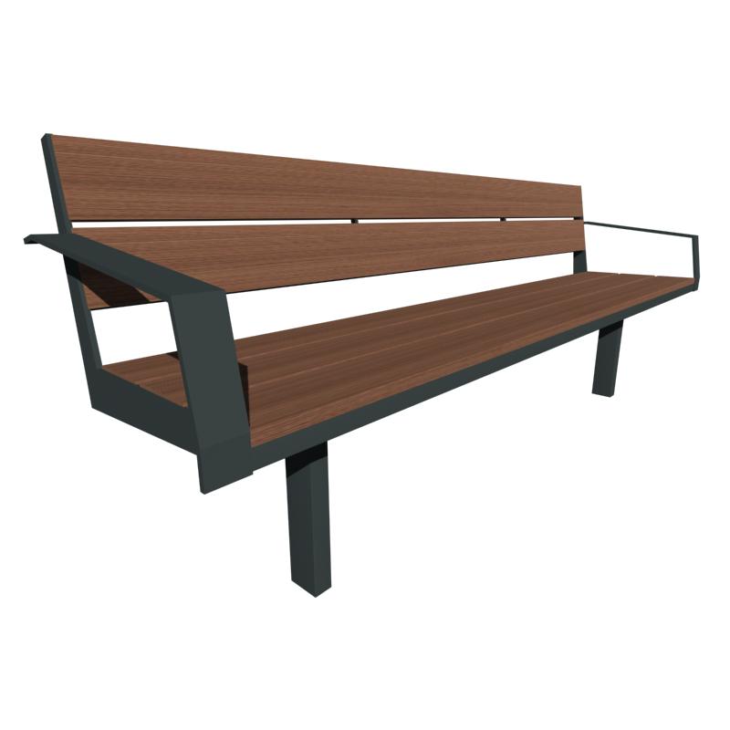Trio típusú WPC támlás, karfás köztéri ülőpad, tüzihorganyozott és RAL színre porfestett,