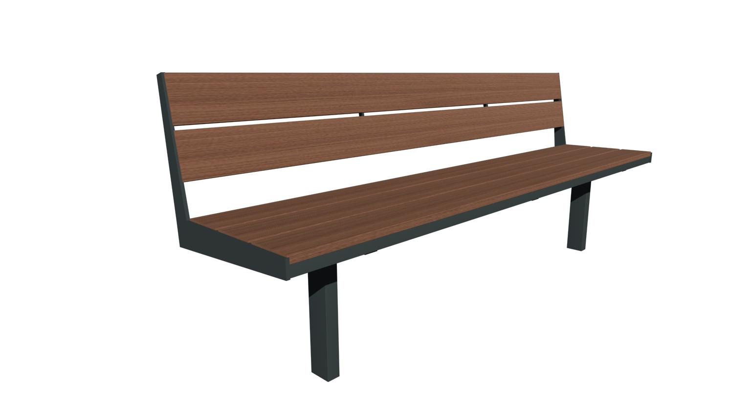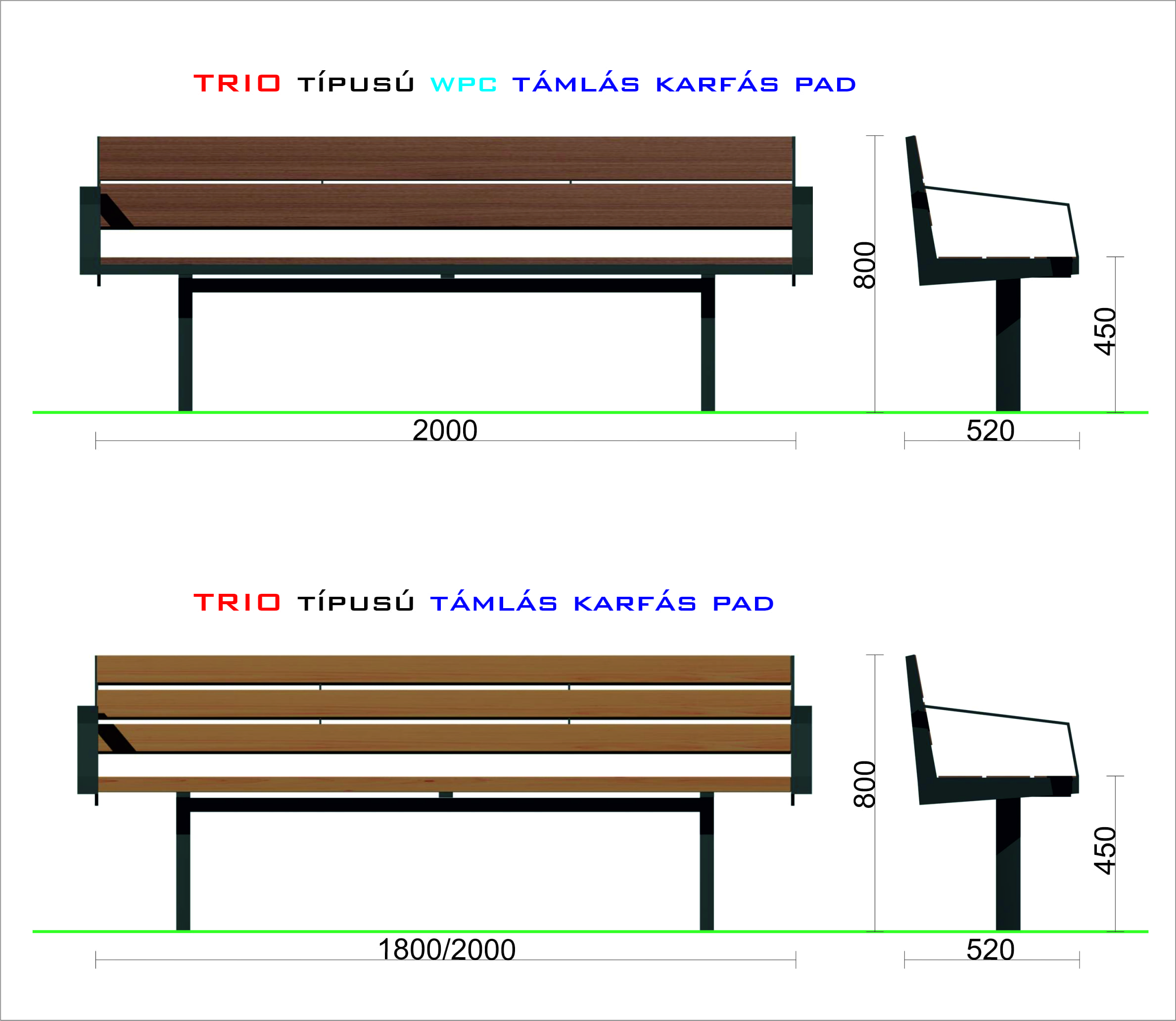 Trio típusú WPC támlás köztéri ülőpad, tüzihorganyozott és RAL színre porfestett,